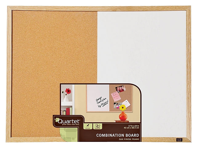 Oak finish combination board. Dry-erase surface is stain resistant and wipes clean with occasional cleaner use. Premium natural cork surface hides pin holes and doesn't crumble. Includes mounting hardware. Dimension of 17 in H x 23 in W.