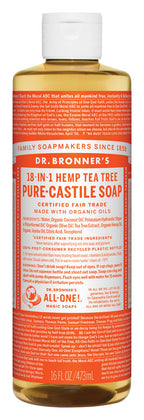 Woodsy and medicinal, our Tea Tree Pure-Castile Liquid Soap contains pure tea tree oil--good for acne-prone skin and dandruff! Dr. Bronner's soap is concentrated, biodegradable, versatile and effective. Made with organic and certified fair trade ingredients, packaged in a 100% post-consumer recycled bottle. All-One!