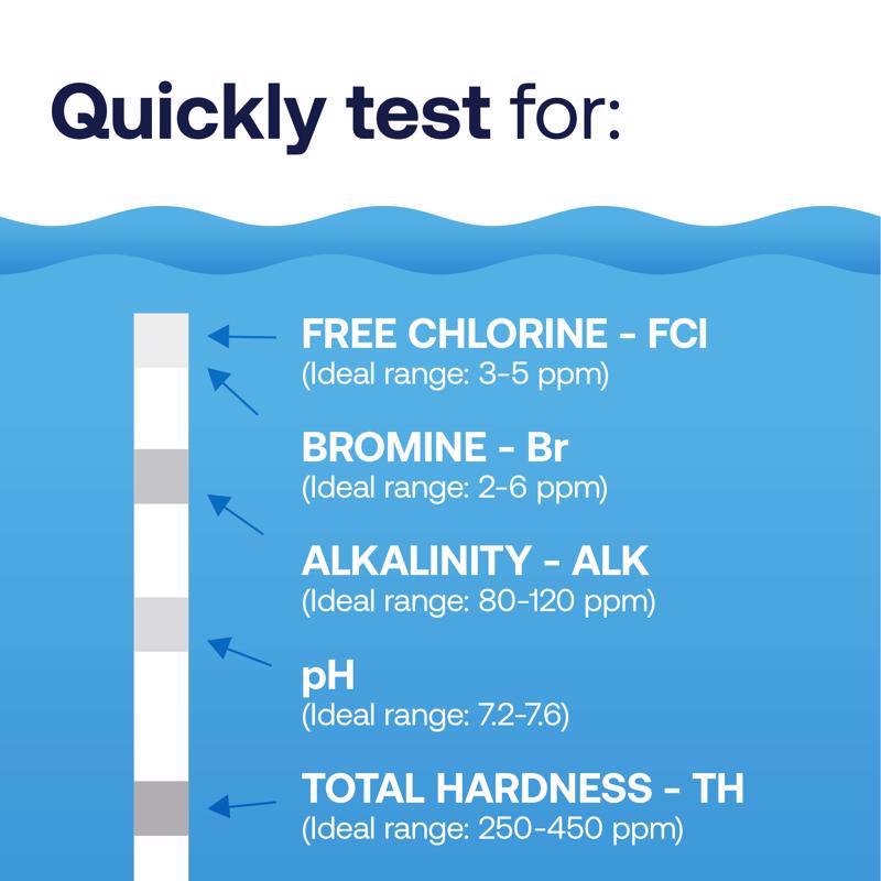 25 strips for testing total bromine, free chlorine, alkalinity, pH and total hardness - Accurate results in seconds - Compatible with bromine and chlorine spas