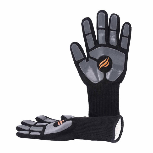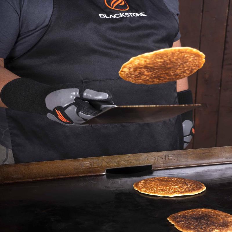 This pair of griddle essentials griddle gloves is heat resistant and designed to protect your hands while cooking on your griddle or grill. With long sleeves and silicone lining on the hands, these gloves are perfect for avoiding grease splatters and handling hot griddle tools for short periods of time. Look stylish and keep your hands protected with these griddle gloves.