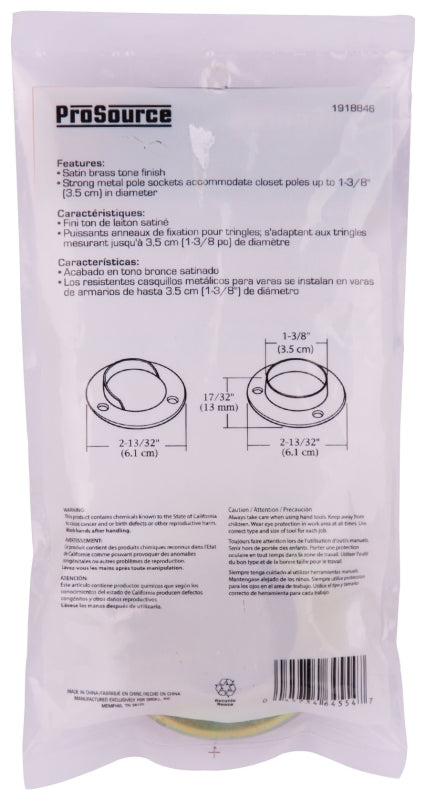 ProSource Closet Pole Socket, Steel, Satin Brass