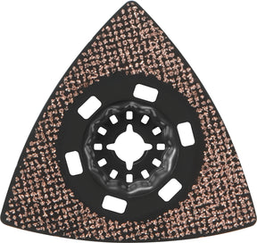 Bosch's Starlock oscillating multi-tool carbide grit delta sanding pad provides professional performance in sanding applications in wood, wood with paint and thinnest. Starlock blades are compatible with oscillating multi tools from Bosch, Fein, Makita, Milwaukee, Rockwell, Hitachi, Rigid, Ryobi and other pro tools. The large delta shaped surface area provides increased coverage and the blades have dust extraction holes for use with vacuum systems.