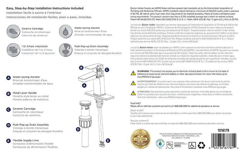 Boston Harbor FS6A0215CP Lavatory Faucet, 1.2 gpm, 1-Handle, 1, 3-Faucet Hole, Metal/Plastic, Chrome Plated