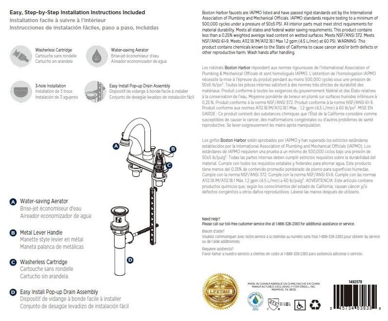 The Boston Harbor lavatory faucet with plastic pop-up is constructed from durable metal. It has a metal lever handle, hybrid waterway, washerless cartridge, 1/2-14 NPSM inlet, 4 in centers, IAMPO and NSF certified and max 1.2 gpm at 60 psi.