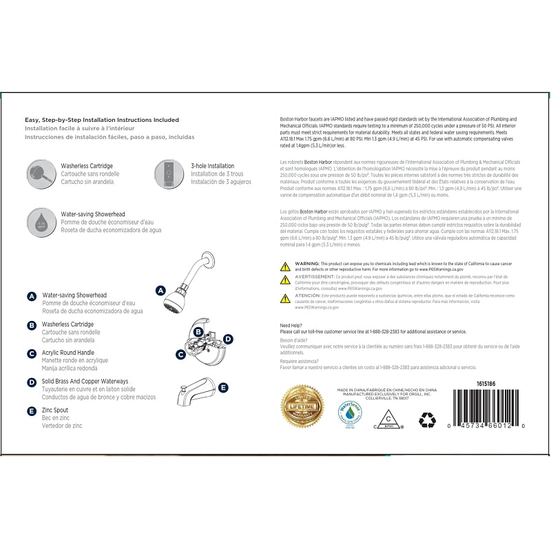 Boston Harbor GU-F1010509CP Tub/Shower, Fixed Mount Showerhead, 1.75 gpm Showerhead, 1 Spray Settings, 1-Handle