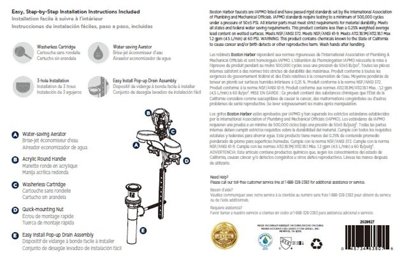 The Boston Harbor lavatory faucet with plastic pop-up is constructed from durable metal. It has a acrylic round handle, hybrid waterway, stainless steel ball valve, 1/2-14 NPSM inlet, 4 in centers, IAMPO and NSF certified and max 1.2 gpm at 60 psi.