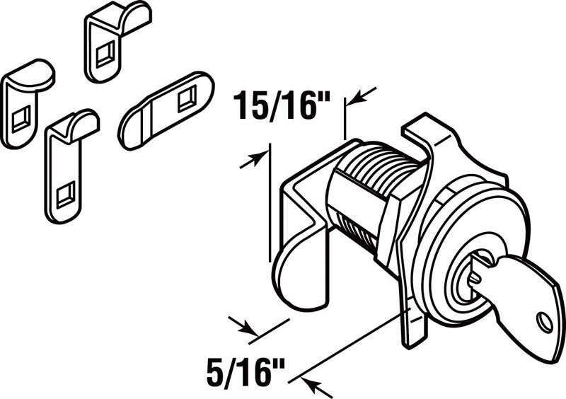 Diecast cylinder with nickel plated face, brass pins, spring steel locking clip and threaded body and nut for optional attachment, replaces many manufacturers original equipment product these multi-cam assortments can eliminate stocking of individual locks rotates 90 degree counter clockwise to open.