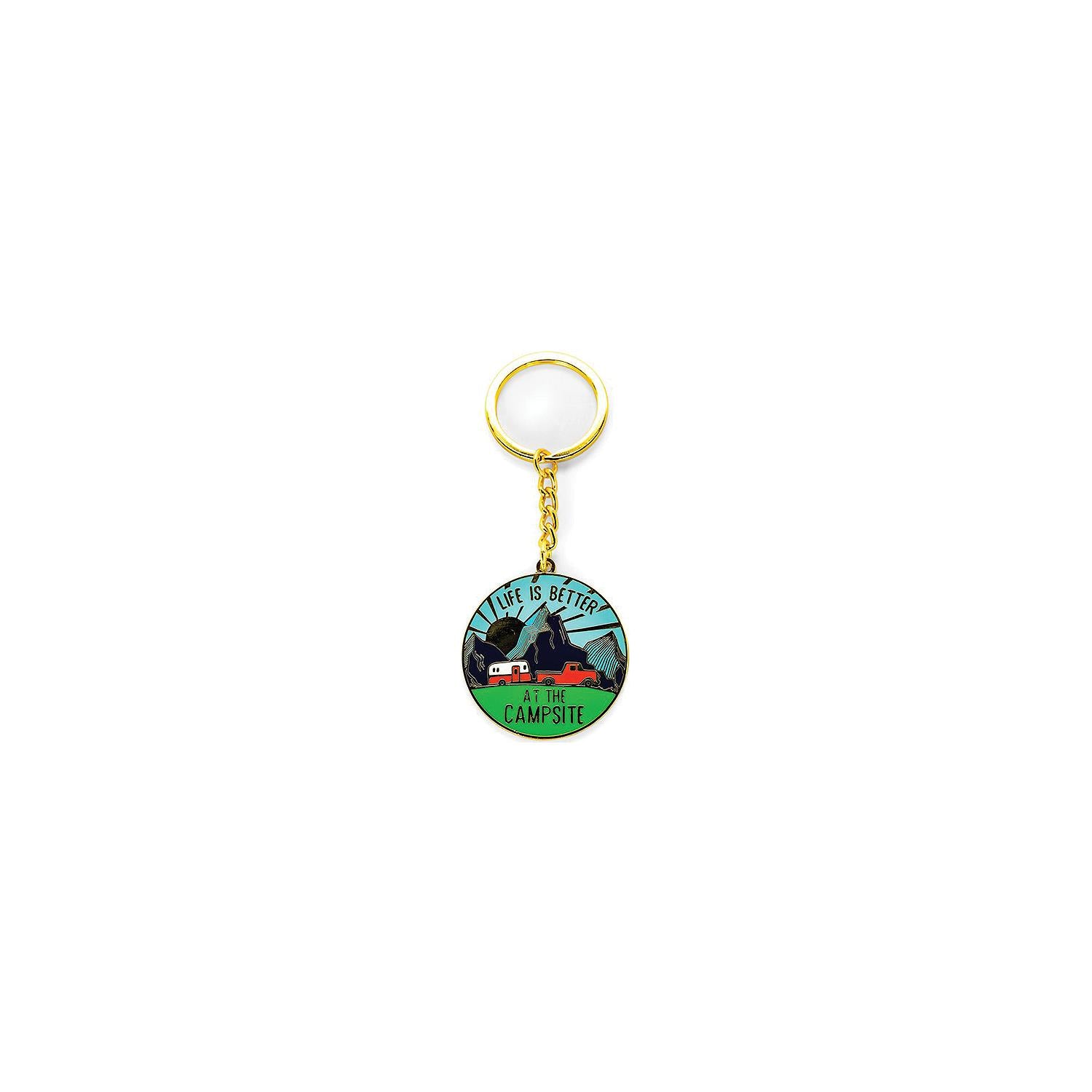 Life is Better at the Campsite Keychain is the perfect accessory for your keys. Made out of durable zinc die cast and coated in enamel. The keychain measures 1-1/2" x 1-1/2".