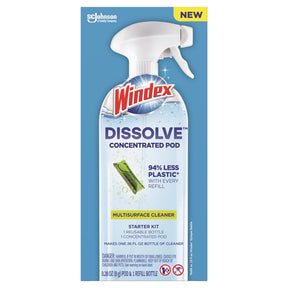The future of cleaning means using less plastic and the future is already here with Windex Dissolve concentrated pod multi surface cleaner From the brand you love, this new and easy way to clean everyday messes and spills saves 94% plastic with every reuse. Windex Dissolve multi surface starter kit contains a reusable spray bottle and one concentrated pod. Every refill helps reduce plastic waste by 94%. Plus, it’s easy to use just drop a pod into the empty bottle, fill bottle up to the shoulder with warm water, twist on the sprayer and shake until the pod dissolves. Discover the power of less and choose dissolvable, not disposable. Windex Dissolve concentrated pod multi surface cleaner packs all the cleaning power you need to make one full 26 oz. bottle of Windex multi surface cleaner. It’s ideal for quick cleans and is safe on hard surfaces, such as tiles, countertops, walls and more. This Windex multi surface cleaner can also be used in other household surfaces, such as sealed stone granite, marble, quartz, stainless steel, formica, ceramic tile, sealed wood, acrylic and fiberglass. It’s perfect for quick touchups and cleanups, providing a streak-free shine with no dull residue left behind. Refilling your Windex Dissolve concentrated pod multi surface Cleaner is a small act that helps you reduce plastic waste. The future of cleaning is here little pod, big impact.
