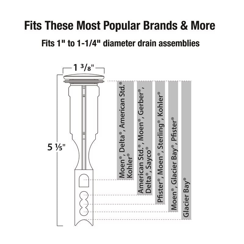 The Danco Bathroom Sink Pop-up Stopper is the perfect replacement for your worn-out, non-functioning lavatory pop-up stopper. The NEW DESIGN FITS MORE LAVATORY POP-UP DRAIN ASSEMBLIES. Danco designed this pop-up stopper with 6 locations for the pop-up assembly rod, so it FITS A WIDE VARIETY OF POP-UP DRAIN ASSEMBLIES and takes the guesswork out of trying to figure out which replacement stopper to purchase. This sink pop-up drain stopper is unique to the market as it truly offers more flexibility and a wide range of fit options which is needed when installing a new replacement pop-up stopper. This bathroom sink pop-up stopper helps protect the drain from objects slipping down the drain and keeps the water flowing down the drain when in the open position. It is constructed of a non-corrosive, durable plastic which is designed for long-lasting reliability and performance. The Danco Bathroom Pop-Up Stopper is easy to install and will look great in your sink with its classic chrome finish.
