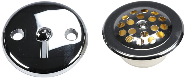 This Danco drain trip lever conversion kit lets you complete the tub drain trim of your bathroom with a finished look. The kit comes with a threaded adapter bushing to fit 1-1/2 in and 1-3/8 in drain shoe sizes. It includes a 2-hole faceplate with finish-matched screws. It also comes with a strainer, an overflow plate and a bath shoe. This complete tub drain trim kit comes in a stylish, scratch-resistant chrome finish. It features a brass construction which provides strength and durability. This item is sure to complement your existing fixtures.