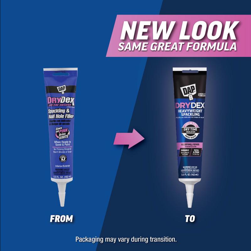 Drydex spackling, America's #1 seller, contains a patented dry time indicator causing the product to change color when optimum dry time is achieved. It goes on pink and turns white.