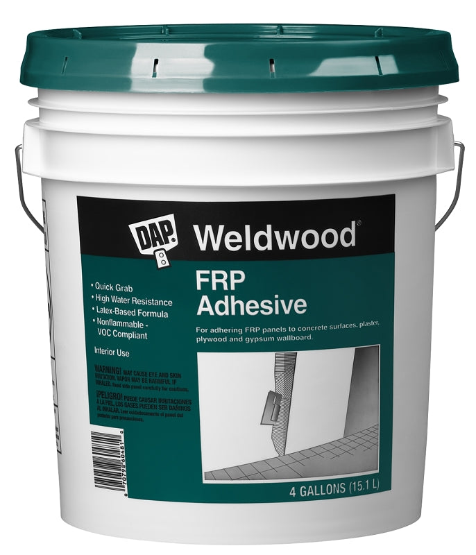 DAP Weldwood FRP adhesive is a non-flammable, freeze/thaw stable, acrylic-based adhesive with good initial tack and easy-spreading characteristics for rapid installation of most FRP (fiberglass reinforced plastic) panels.