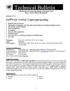 DAP Fast 'N Final lightweight spackling lets you patch and prime in one easy step, saving time and money. It dries fast with no need to sand or prime, letting you paint in minutes. It is easy to apply with one strike of the putty knife. Won't shrink or crack. Ideal for repairing holes, cracks and dents in drywall, plaster, wood and stucco. DAP Fast 'N Final lightweight spackling has a low-VOC content and is low in odor. Interior/exterior use.