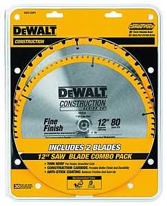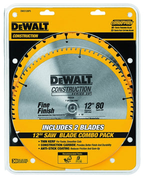 Thin kerf saw blade for use with miter saws and table saws. Includes 2 blades, both 12" diameter, 1" round arbor, alternate top bevel, .097" kerf. No.DW3123 (SKU 656.4629) -5 degree hook angle, 32 teeth, general purpose blade for all-purpose cutting in natural wood, plywood and wood composites. No.DW3128 (SKU 678.1306) -5 degree hook angle, 80 teeth, fine crosscut blade for fine crosscuts in natural wood, plywood and wood composites.
