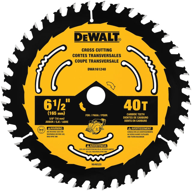 DEWALT DWA261240 Circular Saw Blade, 6-1/2 in Dia, 5/8 in Arbor, 40-Teeth, Tungsten Carbide Cutting Edge