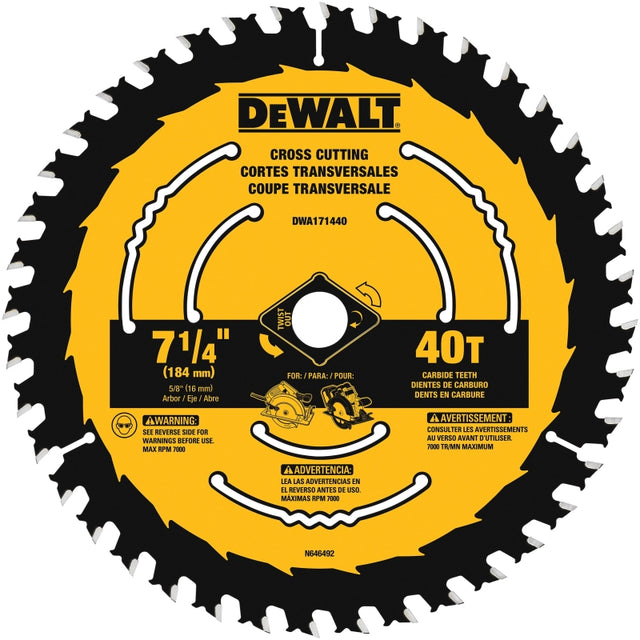 DEWALT DWA171440 Circular Saw Blade, 7-1/4 in Dia, 5/8 in Arbor, 40-Teeth, Tungsten Carbide Cutting Edge, 1/PK is backordered and will ship as soon as it is back in stock.
