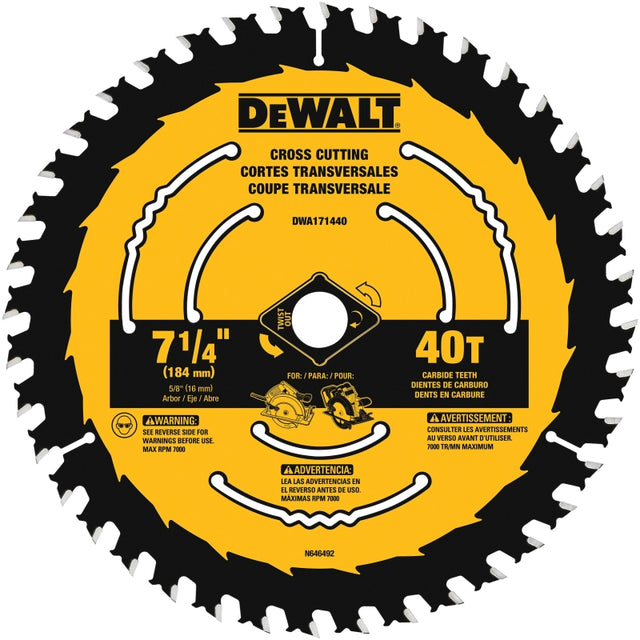 DEWALT DWA171440B10 Circular Saw Blade, 7-1/4 in Dia, 5/8 in Arbor, 40-Teeth, Tungsten Carbide Cutting Edge, Pack of 10