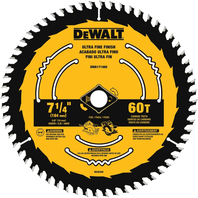 DEWALT DWA171460 Circular Saw Blade, 7-1/4 in Dia, 5/8 in Arbor, 60-Teeth, Tungsten Carbide Cutting Edge