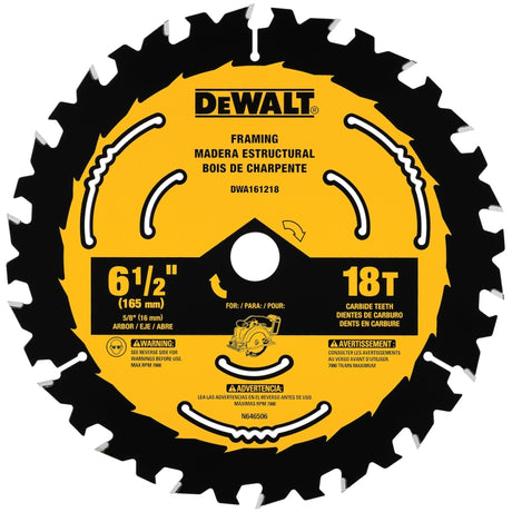 DEWALT DWA161218 Circular Saw Blade, 6-1/2 in Dia, 5/8 in Arbor, 18-Teeth