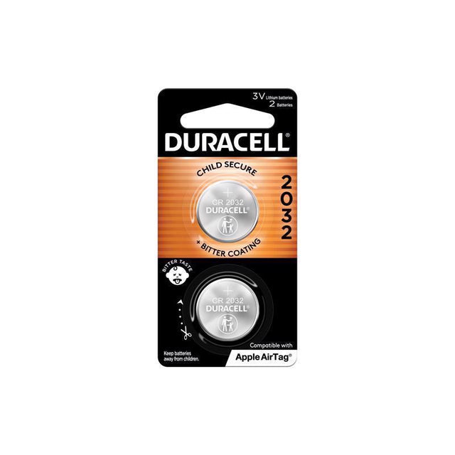 Featuring the long lasting Duracell Lithium Coin 2032 cell batteries with power you can count on Designed with precision for seamless compatibility for your most important devices like Apple AirTag. Experience unparalleled safety with their unique bitter coating, specially formulated to deter accidental swallowing. With child resistant packaging, Duracell prioritizes safety and power. Duracell Lithium Coin Batteries are engineered to provide long lasting, dependable performance, guaranteed for 10 years in storage, so you can be confident they will be ready when you need them. From Apple AirTags, key fobs, watches, calculators, remote controls to vital glucose monitors, and even toys these batteries ensure your devices operate powerfully day in and day out, delivering performance in everyday essentials. Apple recommends the Duracell CR2032 with bitter coating to help discourage swallowing. Duracell remains the trusted choice for millions worldwide and is the #1 trusted battery brand. Choose from our versatile range of packs, including 1, 2, 4, 6, or 8, to cater precisely to your power needs. Don't settle for anything less than the power you can trust. Elevate your devices with Duracell Lithium Coin Batteries.