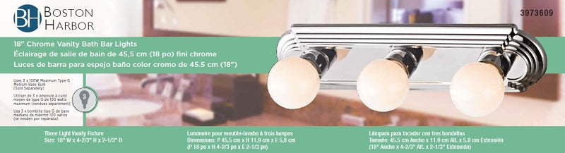 Boston Harbor 046043-CHROME Vanity Bar Fixture, 100 W, 3-Lamp, G Lamp, Steel Fixture, Polished Chrome Fixture