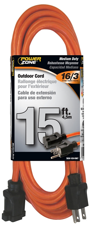 PowerZone OR501615 Extension Cord, 16 AWG Cable, 5-15P Grounded Plug, 5-15R Grounded Receptacle, 15 ft L, 125 V
