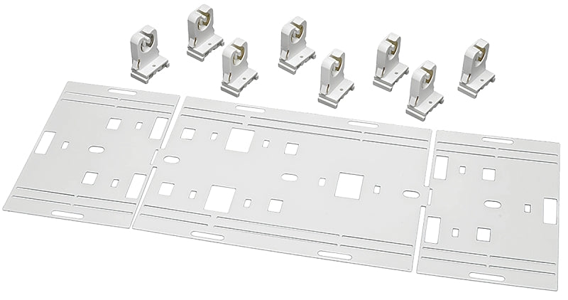 Metal bracket used to retrofit 8 ft Fluorescent strip lights to energy efficient LEDs. Converts both T12 and T8 fixtures.