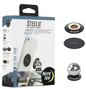 This powerful magnetic phone mounting system allows you to easily attach, detach and rotate your phone on the dash mount. The low-profile metal plate adheres to your phone or case, creating a secure magnetic connection with the Orbiter magnetic socket. By combining high-friction materials with magnetic strength, the Orbiter keeps your phone secure and accessible. The Steelie Orbiter dash mount kit keeps your phone conveniently accessible on the dash while letting you easily adjust your screen for the perfect viewing angle. This kit combines a dash mount with the powerful Orbiter magnetic socket and a low-profile metal plate that easily attaches to your phone or case. Our dash mount adheres on any vehicle dash with strong, removable 3M VHB adhesive for a secure hold. The Orbiter magnetic socket attaches to the dash mount using a powerful neodymium magnet and silicone center for a secure connection and smooth glide. By combining magnetic power and a thin high-friction ring designed to prevent slipping, the phone docking surface of the Orbiter magnetic socket holds your phone securely in place. Once the dash mount and Orbiter magnetic socket are affixed to your vehicle dash, simply adhere the low-profile metal plate to your phone or case and you're ready to quickly attach, detach and rotate your phone for the perfect viewing angle.