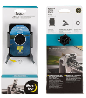 Dock your phone for the drive ahead with the universal, lightweight and adjustable squeeze dash mount. Easy to set up and secure, this ball-and-socket mount is designed to hold virtually any phone with a case and accessories, keeping your apps and maps in clear view with just a squeeze. The Squeeze Clamp features grippy arms and inner continuous force springs that amplify the hold of your phone, keeping it in place through off-roading adventures, tight turns, road trips and beyond. Plus, the easy-to-squeeze levers at its base allow for effortless securing and releasing no extra grip strength needed. The included Dash Mount sticks anywhere on your dash with 3M VHB foam adhesive, adhering to flat and slightly curved surfaces. At the top of the Dash Mount is a rounded ball joint, designed to connect to the socket back of the Squeeze Clamp in a snap. The included attachment collar links the dash mount and Squeeze Clamp together, allowing you to adjust the Squeeze Clamp to your perfect viewing angle and tighten it in place. As a bonus, on the back of the dash mount is an integrated hook for your charging/aux cord to keep it in place and out of the way. No matter your phone, car or destination, Squeeze will hold strong through it all.