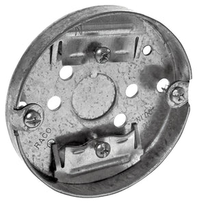 Raco Drawn Fan Box, Cable Entry: 1/2 in, Number of Knockouts: 5, Number of Gangs: 1, Cubic Capacity: 4 cu-in, Round, Steel, Gray, 3-3/8 in W, 1/2 in D, 3-3/8 in H, Ceiling Mounting, Suitable for: Ceiling or Wall Lighting Fixture