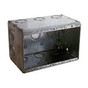 Welded construction. Rectangular shape fits square cuts in block. Device ears inside the box, preventing mortar from getting in the device hole. Use a standard wallplate cover. Concentric knockouts, six end, three bottom and four sides. Non-gangable. 47.8 cu-in. 5-19/32 in x 2-1/2 in. Used in 4 in block walls. UL Listed.