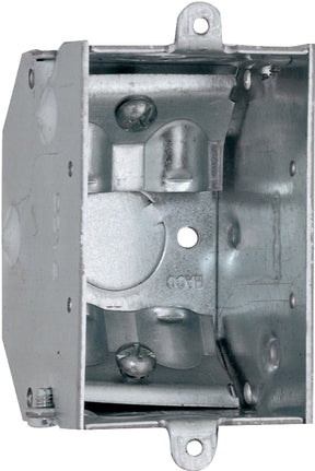 Gangable 3 in x 2 in switch box, offers the option of constructing a box to hold two or more devices. Beveled corners prevent the clamp screws from protruding into the back wall. With non-metallic sheathed cable clamps. Acceptable for use in 2 hrs fire rated walls. Four cable knockouts (end). Two 1/2 in conduit knockouts (end). 1/2 in conduit knockouts (bottom). With leveling bumps. No plaster ears, not suitable for old work. 2-1/4 in D. 10.5 cu-in. UL listed.