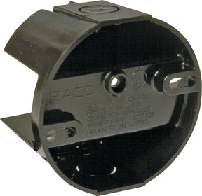 Round polycarbonate, 4 in Dia, 12.5 cu-in black non-metallic ceiling fan support saddle box, used in new work to mount a ceiling fan or heavy light fixture. Supports a 70 lb fan or 210 lb fixture. Saddle design straddles standard joist. Hands-free installation. 1/2 in setback. Two 1/2 in knock outs on the side. Four cable clamps, mounting hardware, instructions and high-strength, hardened screws included. 2 hrs fire rating, UL Orange Book. UL listed.