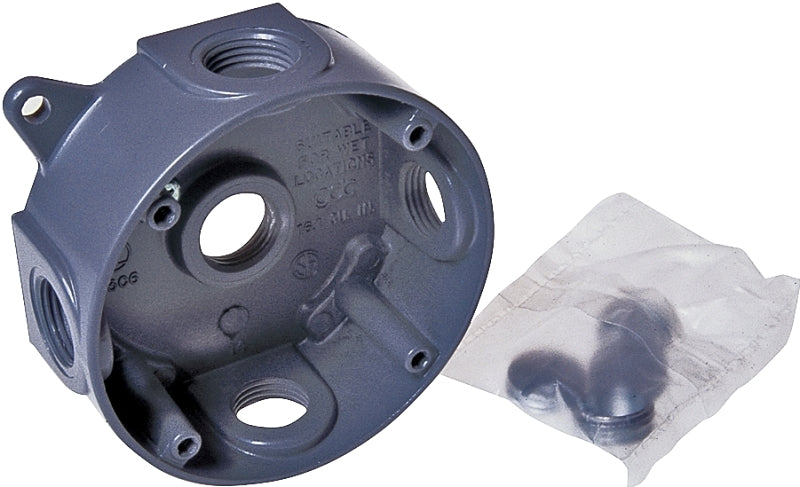 For use in branch circuit wiring in wet, damp or dry locations. Designed for use as a weatherproof junction box and used with Bell Outdoor round cluster covers and round lamp holder combinations. Die-cast aluminum construction. Powder coat finish. Reinforced connector outlets. Cast-in mounting lugs, four closure plugs included and installed ground screw. 16.1 cu-in capacity. Six 10-24 tapped holes. 4 in Dia x 1-1/2 in D. UL listed.