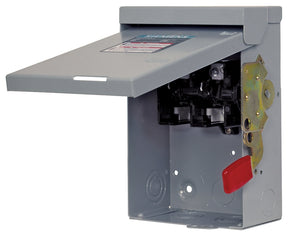 Siemens low voltage VBII double-break enclosed safety switch. Series A light two-pole two-wire non-fused general duty. Rated 240 V 60 A.