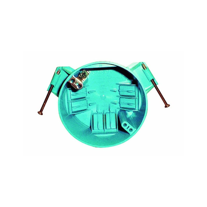 Carlon Ceiling Box, Clamp Cable Entry, 20 cu-in, Round Shape, Polycarbonate, Blue, 4 in Width, 4 in Depth, 2-1/4 in Height, Captive Nail Mounting, Includes: Ground Lug and Screw