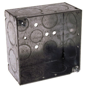 Raco Electrical Box, Number of Knockouts: 13, Knockout Size: 3/4, 1, 1/2 in, Number of Gangs: 2, Square, IP Rating: NEMA OS1, Cubic Capacity: 30.3 cu-in, Dimensions: 4 in H x 4 in W x 2-1/4 in D, Steel, Gray, Flush, Surface Mounting