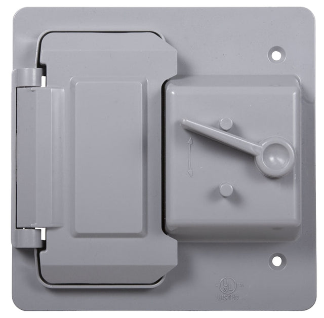 Bell Outdoor Weatherproof Toggle Cover, Number of Gangs: 2, Polycarbonate, Gray, 4-3/4 in L, 2 in W, 4-3/4 in H, NEMA Rating: 3R, Vertical Mounting, Includes: Attached Gasket, Mounting Hardware