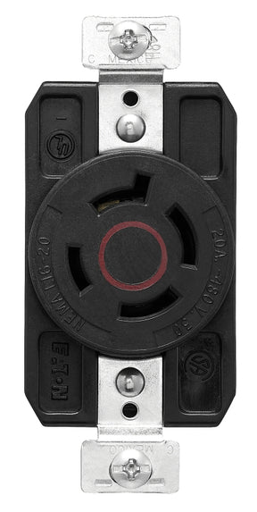 Arrow Hart Locking Single Receptacle, 480 VAC, 20 A, 3 Pole, 4 Wires, 3 ph, Back and Side Wiring, 14 to 8 AWG Wire, NEMA L16-20, -40 to 158 deg F Operating, Nylon, Black/Red, Dimensions: 3.64 in H x 1.63 in W x 1.06 in D
