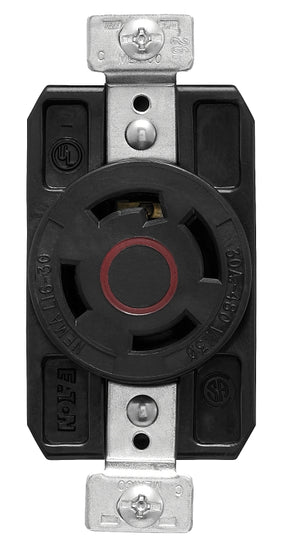 Arrow Hart Locking Single Receptacle, 480 VAC, 30 A, 3 Pole, 4 Wires, 3 ph, Back and Side Wiring, 14 to 8 AWG Wire, NEMA L16-30, -40 to 158 deg F Operating, Nylon, Black/Red, Dimensions: 3.64 in H x 1.63 in W x 1.06 in D