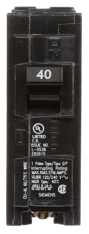 Siemens Circuit Breaker, Full Module, Mini, Standard, 120 VAC, 40 A, 60 hz Operating Frequency, 1 ph, 1 Pole, 10 kA Interrupt, QP Frame, Toggle Actuator, 8 to 4, 8 to 6 AWG Wire, Lug Terminal, Plug Mounting, Dimensions: 3 in H x 1 in W x 3 in D, 40 deg C Operating, Suitable for: Siemens EQ Load Center
