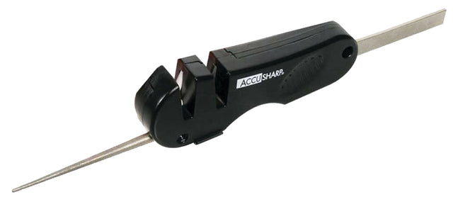 The Accusharp 4-in-1 knife and tool sharpener combines every sharpening necessity into one pocket-sized unit. Featuring coarse tungsten carbide sharpening blades and fine ceramic rods, the unit also comes with a retractable diamond-tapered rod used for deep serrations. The rod also has a groove for all of your hooks and darts. Plus, the unit comes with a retractable flat diamond file for users who prefer a continuous surface for their sharpening needs. The model is finished off with molded rubber feet to keep the unit steady while in use.