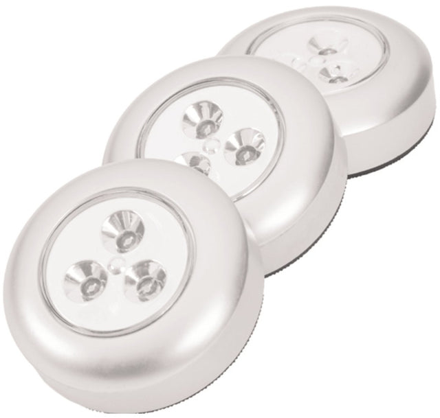 Mounts anywhere, adhesive backing. 13.5 Lumens. Tapping the center of the light turns it On/Off. Uses 3 AAA batteries (not included).