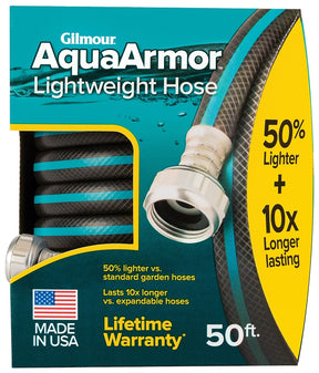 Better than expandable, fabric and even standard garden hoses, the Gilmour AquaArmor lightweight hose is designed for the ultimate lightweight experience. Revolutionary, patent-pending technology makes this hose 50% lighter than standard hoses and up to 10x longer-lasting than expandable hoses. Its abrasion-resistant cover, up to 15x stronger than fabric hoses, withstands extreme temperatures and provides advanced UV protection. A proprietary material allows it to unkink itself and its smooth cover glides over rough surfaces without snagging or tearing. Industrial strength internal coils offer kink protection at ends and patented, crushproof couplings are ergonomically designed for easy on/off at the spigot. Coiling flat for storage, the AquaArmor lightweight hose becomes round for maximum flow during use and it's compatible with all nozzles and sprinklers, as well as pressure washers. It's drinking water safe, free of lead, BPA, phthalates and PVC and ideal for food gardens, RVs, boats and more.