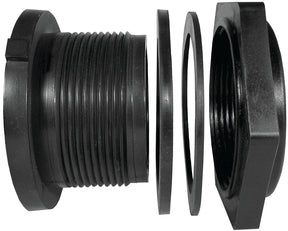 Left hand external thread and nut, FPT internal thread, for use with tanks having a wall thickness of 1/16 to 1/2 in. Polypropylene body and nut, polyethylene friction washer, EPDM sealing washer. The tank fittings are non-food-grade.