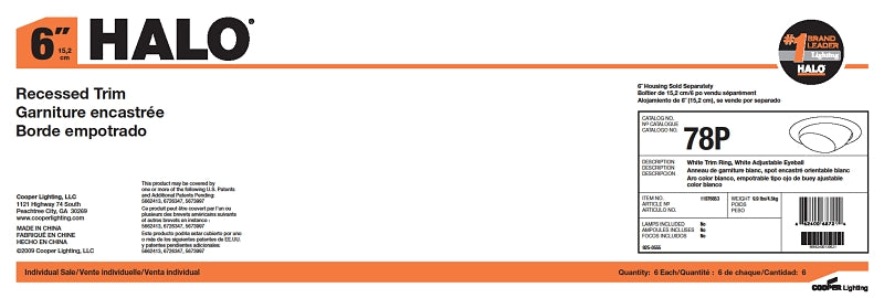 Halo 78P Recessed Light Trim, 6 in Dia, 4-1/8 in OAH, Metal Body, White is backordered and will ship as soon as it is back in stock.