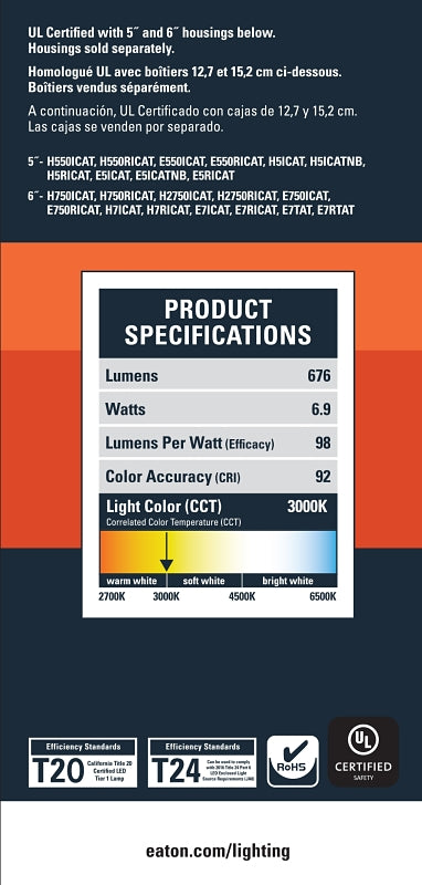 Compatible with most recessed housings. Flexible mounting. Over 600 Lumens, 50,000 hrs. 3000K. 35 deg tilt up to 360 deg rotation. Dimmable to 5% with select dimmers. Adjustable Gimbal for accent, task, grazing and downlighting. Easy installation with mounting clips. Damp location listed and IC (insulated ceiling) rated.