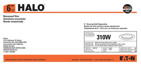 Halo 30WATH Baffle Trim, 6 in Dia, 5 in OAH, Metal Body, White