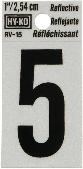 Hy-Ko RV-15/5 Reflective Sign, Character: 5, 1 in H Character, Black Character, Silver Background, Vinyl, Pack of 10